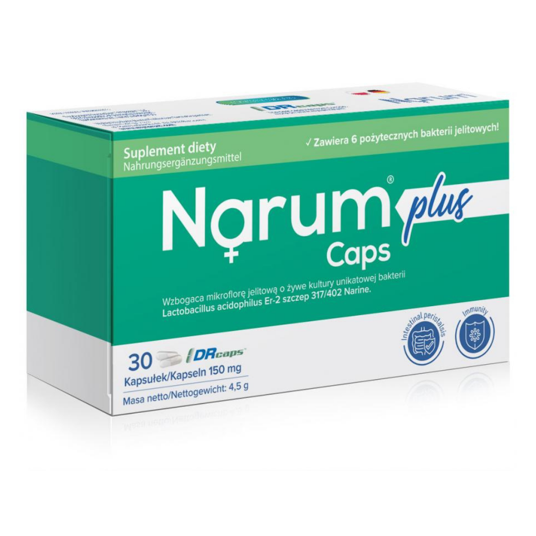 Narum Plus w formie kapsułek służy do utrzymania składu i aktywności biologicznej normalnej mikroflory jelitowej u dzieci i dorosłych.