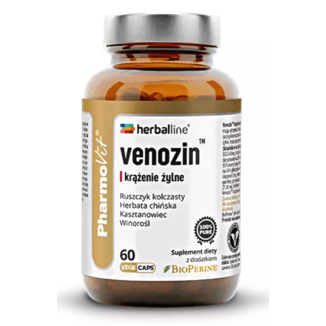 Venozin™ krążenie żylne to kompozycja siedmiu ekstraktów roślinnych oraz BioPerine®. Kasztanowiec pomaga utrzymać właściwe krążenie krwi w nogach. Miłorząb japoński wspiera krążenie obwodowe co jest szczególnie ważne dla wzroku i słuchu. Zielona herbata wspomaga pracę serca. Ruszczyk wspomaga krążenie żylne, może przynieść ulgę i uczucie lekkości w nogach. Winorośl wspiera integralność układu żylnego.